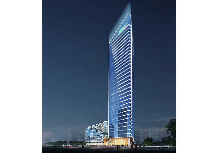 建設用地面積為 8788 ㎡,建筑分為地上辦公三十三層,高度為 147.25 米,地下為二層地下室。總建筑面積為 77796.11 ㎡ ,其中計容建筑面積52728 ㎡,不計容建筑面積 25068.11 ㎡。考慮基地的用地性質(zhì)及城市規(guī)劃的空間要求,建筑采用退臺式裙房及超高層塔樓組合布局方式,強調(diào)高層塔樓開敞及景觀視線的通透感。下部設商業(yè)及服務空間,便于靈活組合空間,為提高觀景率,建筑采用方正,大開間退臺式平面,有利于觀景和通風等多方面的要求。建筑在最大限度的保證南北朝向的同時,避免基地內(nèi)高層建筑與相鄰建筑的視線干擾對視,適當拉開間距以降低壓抑感。